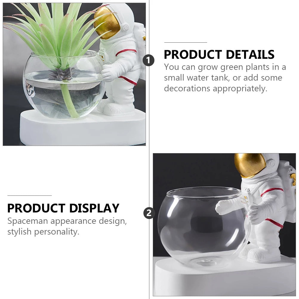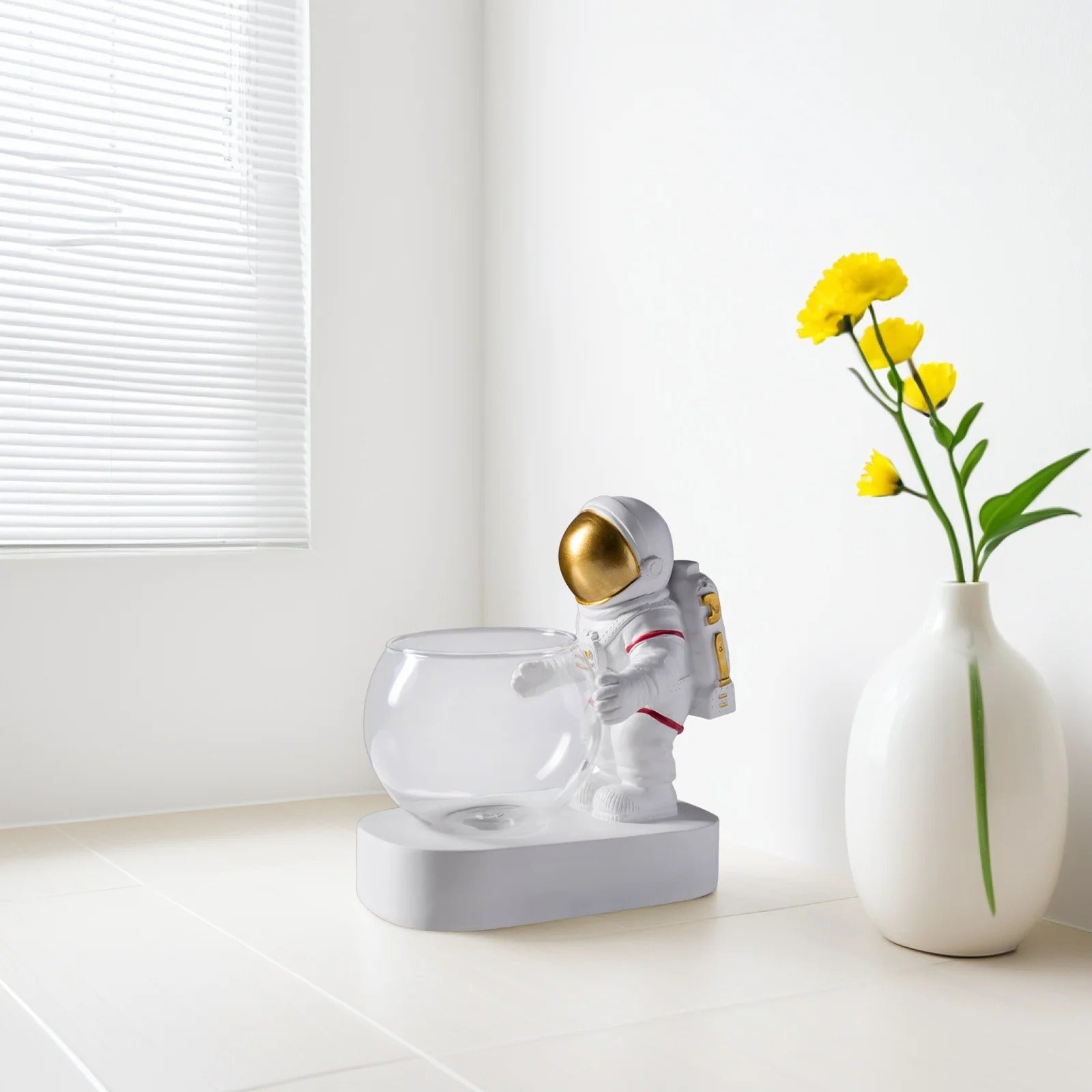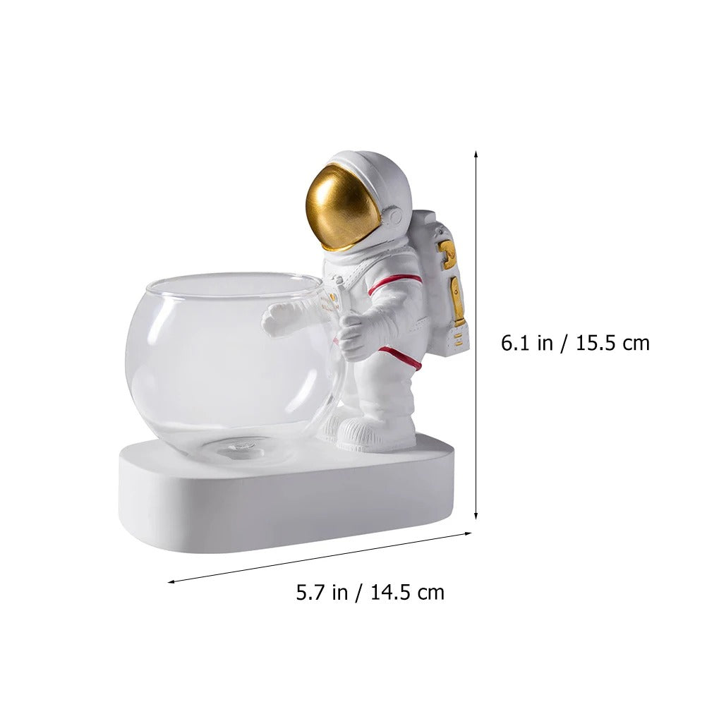 A: Yes, the astronaut is permanently secured to the white base platform for stability, while the glass bowl is removable for easy cleaning and plant arrangement.