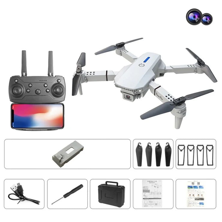 A: The package includes the drone, remote control, battery, USB charging cable, spare propellers, propeller guards, carrying case, and instruction manual.