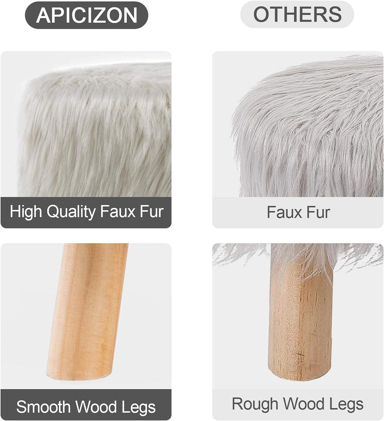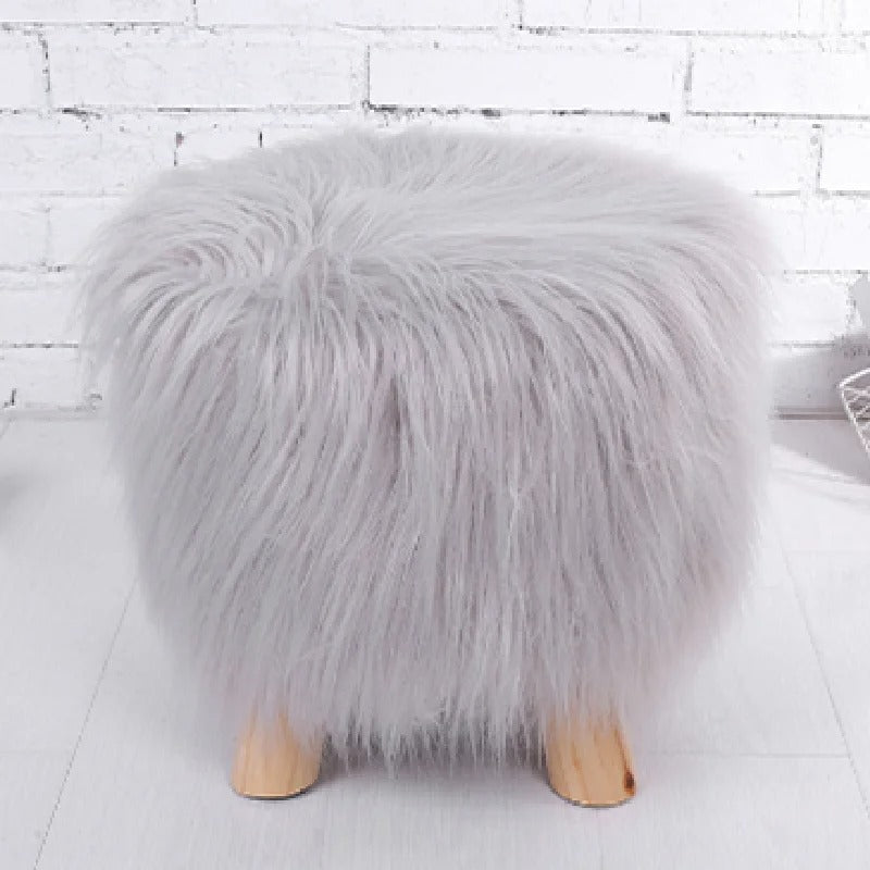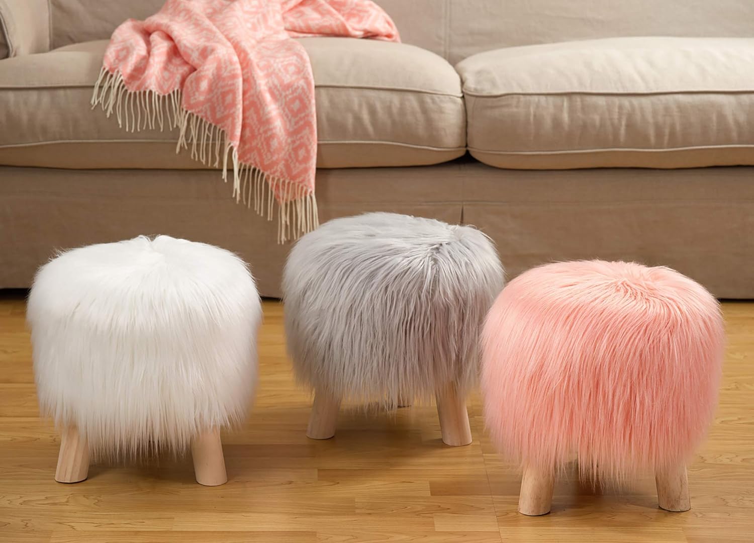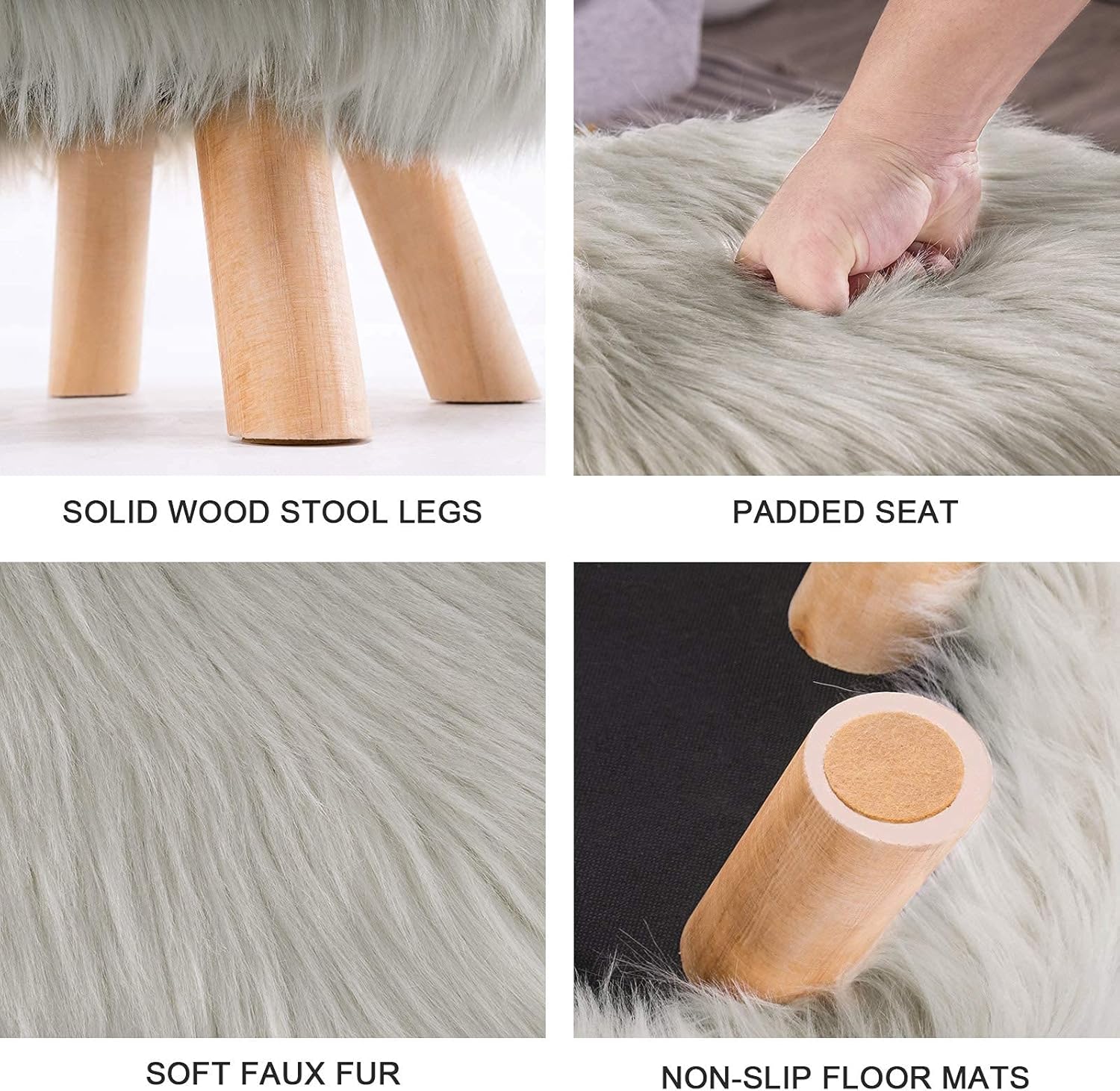 A: Our stools feature higher density faux fur, solid wood legs (not composite), better padding, and smooth leg finish compared to lower-quality options with rough wood and thin fur.