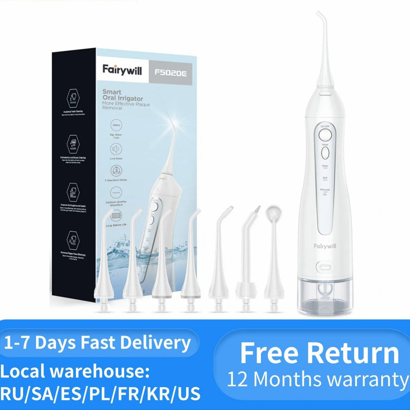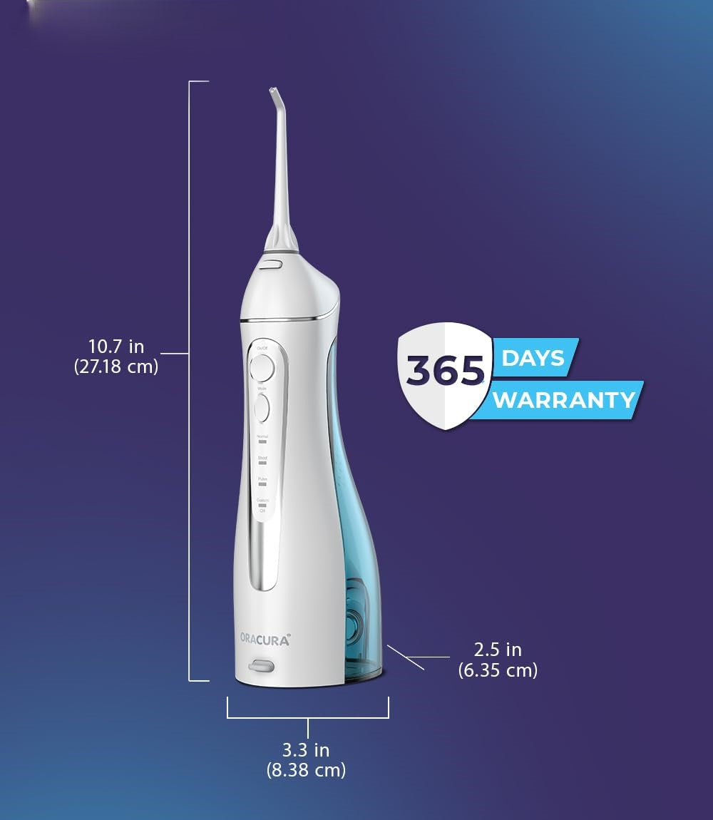 A: You'll receive everything needed for comprehensive oral care: the main water flosser unit, 450ml water tank, 8 specialized nozzle tips (2 standard, 2 tongue scrapers, 1 orthodontic, 1 pocket tip, 1 implant tip, 1 nasal tip), USB charging cable, protective storage pouch, detailed manual, and full 365-day warranty coverage.