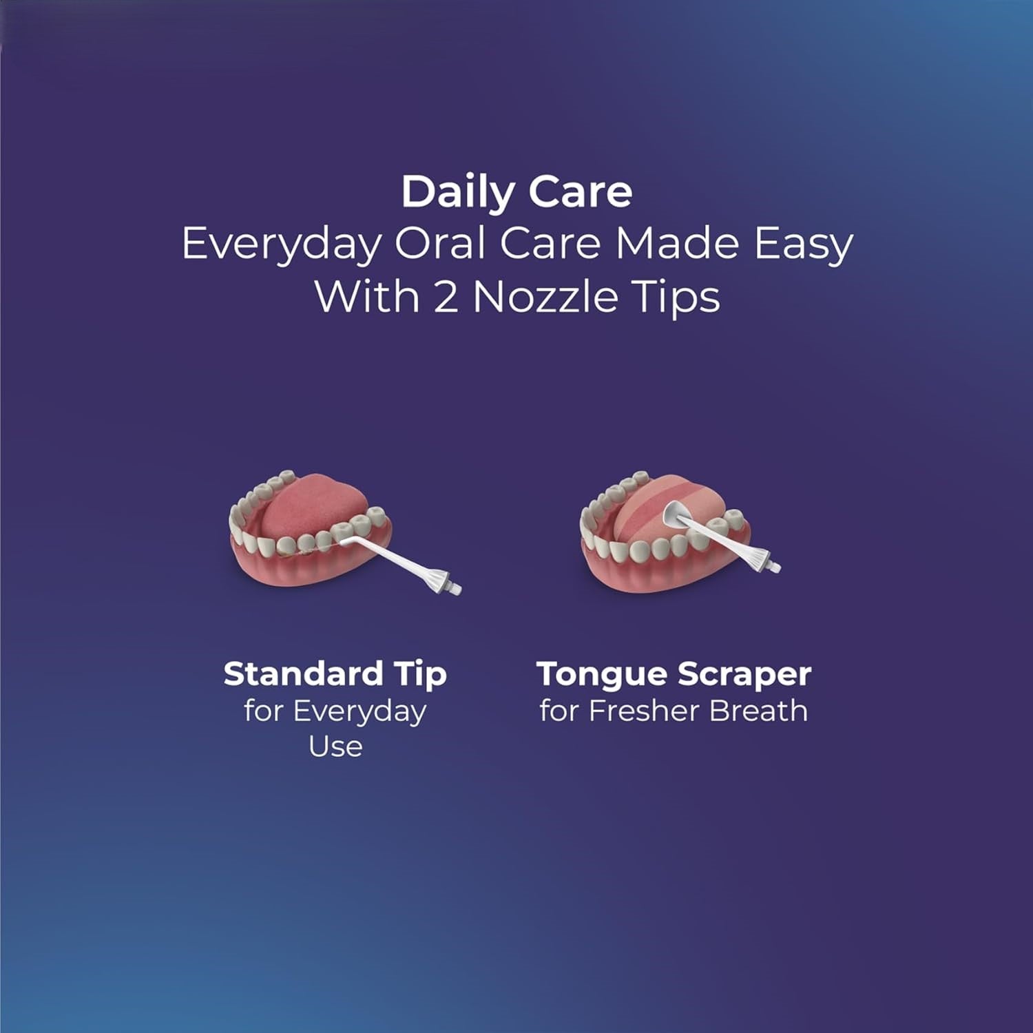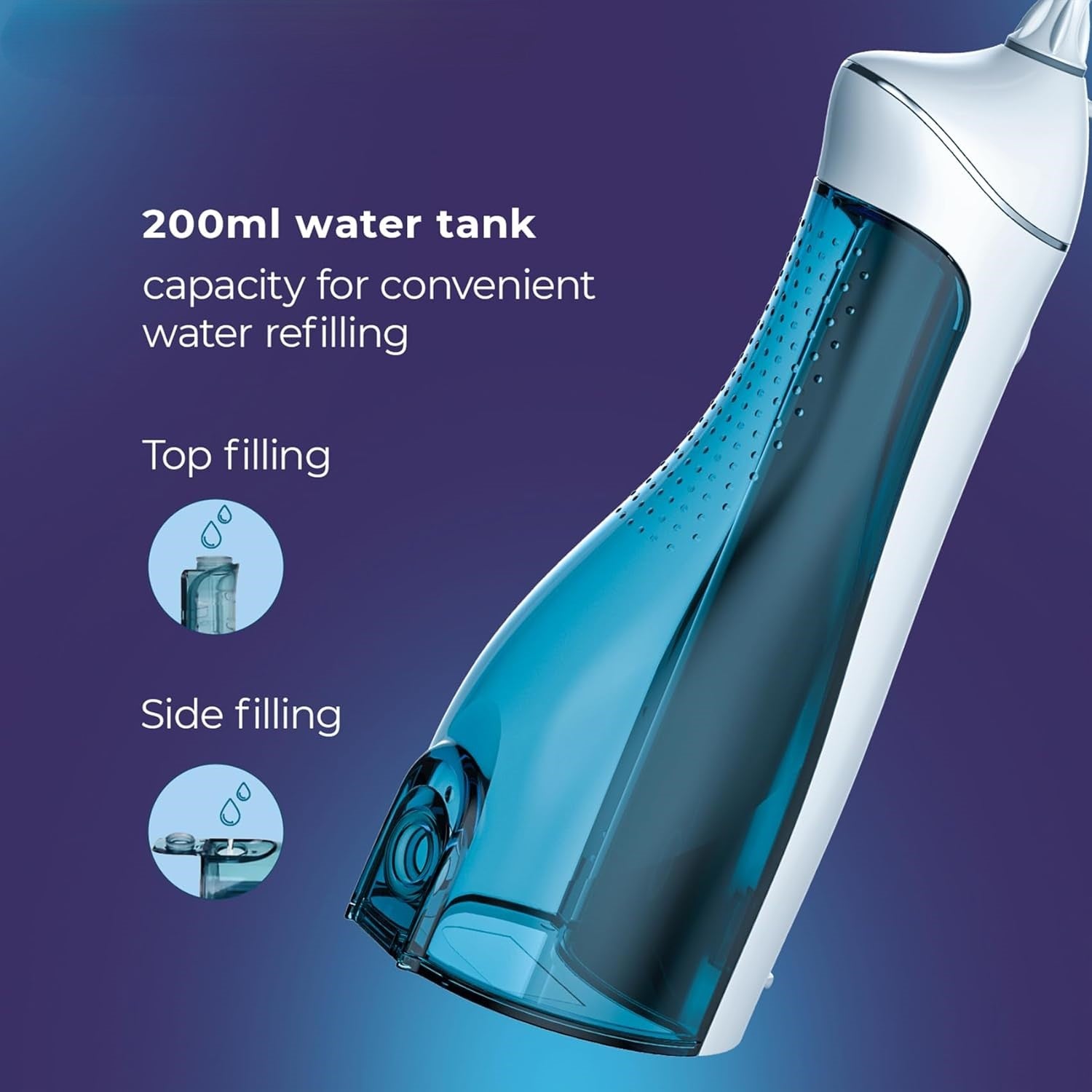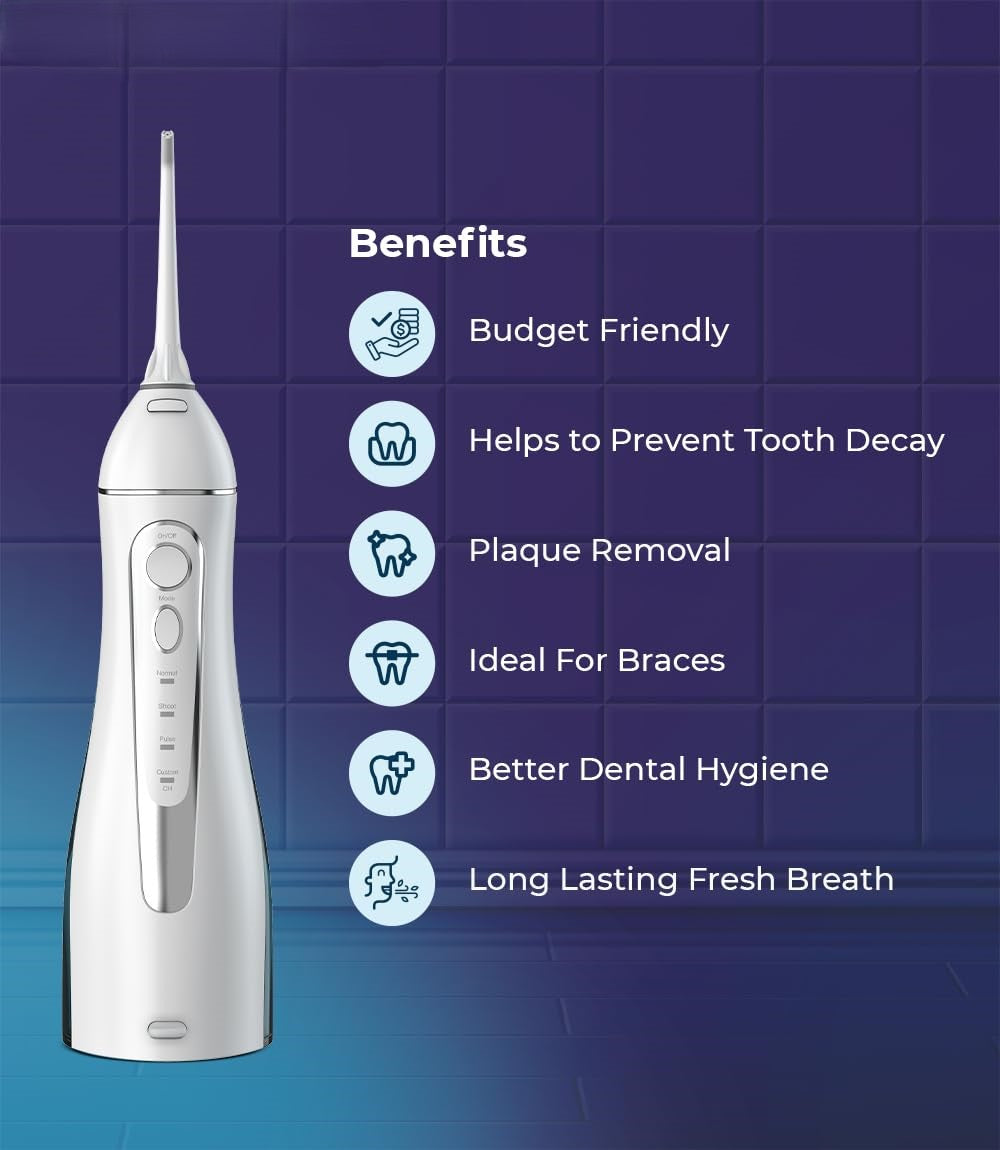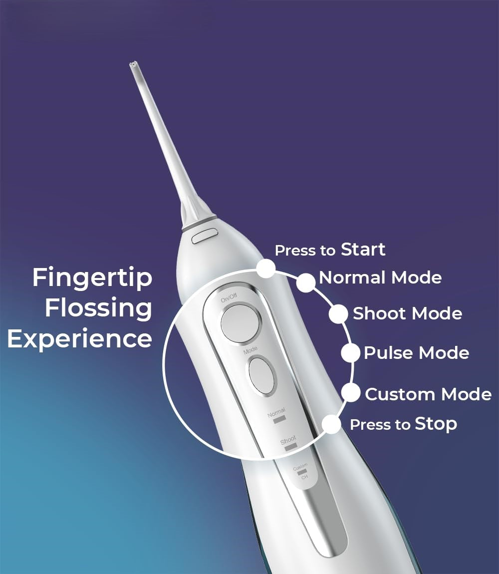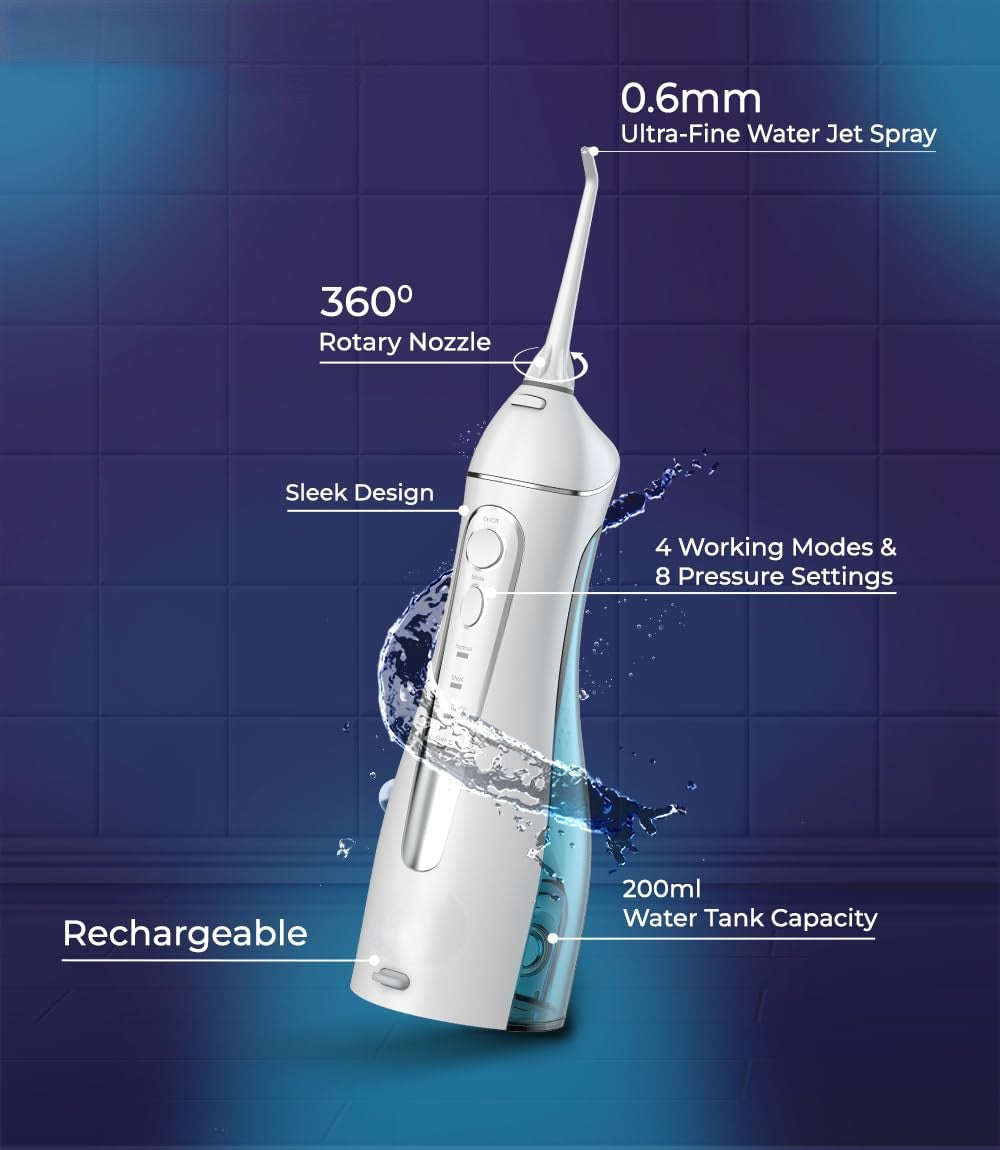 A: The advanced 360° rotating nozzle allows you to reach every angle around your teeth and gums without awkward hand positioning. This ensures thorough cleaning of hard-to-reach areas like back molars and tight spaces between teeth, making it far more effective than static water flossers or traditional string floss.