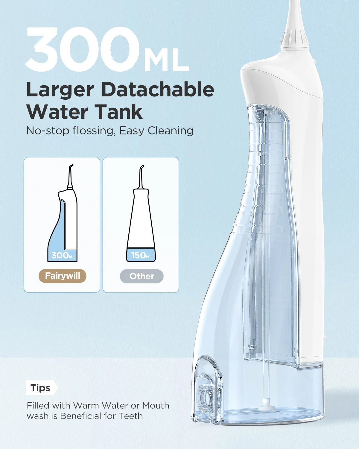 A: The large 450ml capacity provides approximately 90-120 seconds of continuous use per fill - enough for 2-3 complete oral care sessions. For families, simply swap the nozzle tips (each person should have their own designated tips) and refill as needed. The rechargeable battery lasts up to 21 days with regular daily use.
