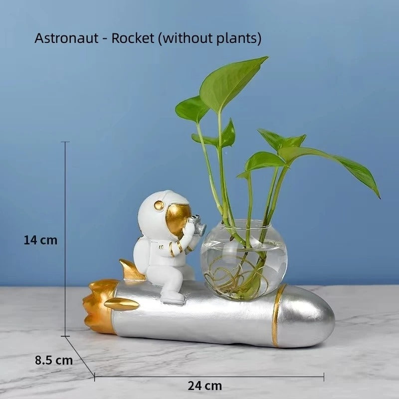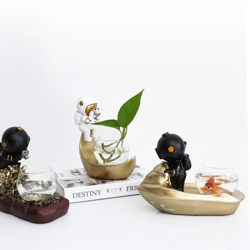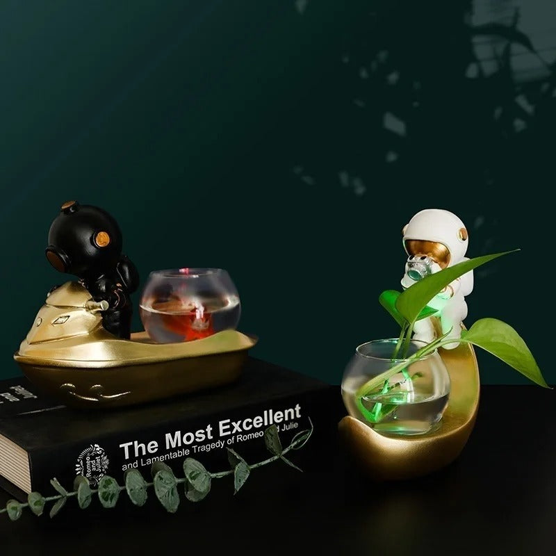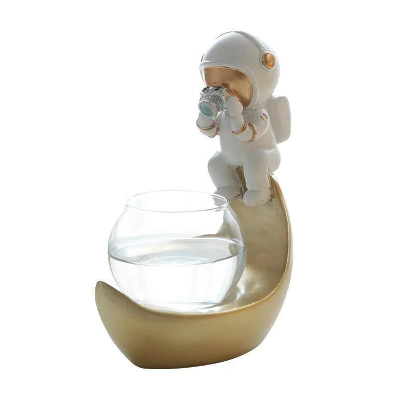 A: The astronaut is permanently attached to the metallic base for stability and design integrity, but the glass vessel is removable for easy filling and cleaning.