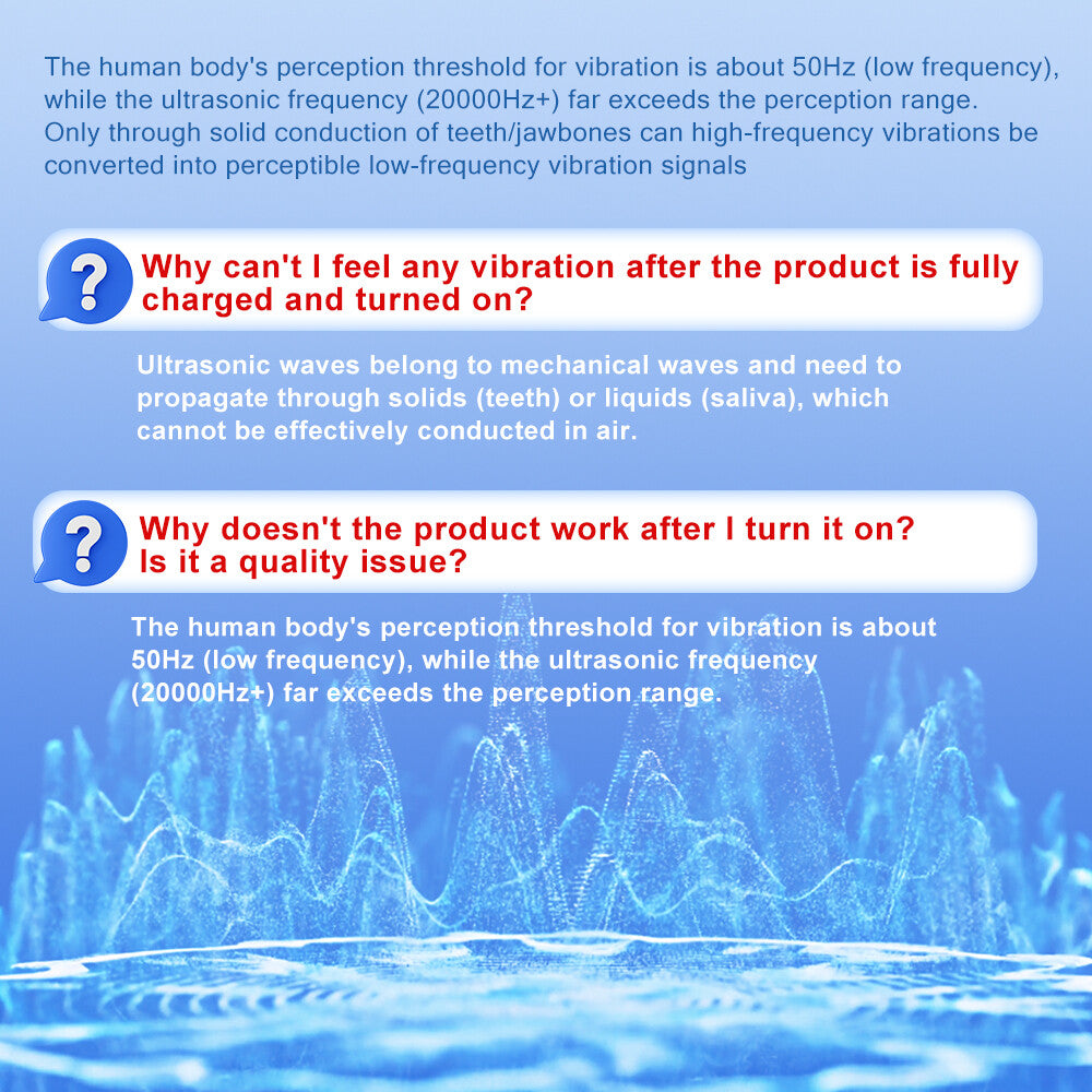 A: Ultrasonic frequencies (20,000Hz+) exceed human perception range of about 50Hz. The vibrations are only felt when the tool makes contact with teeth or saliva, as ultrasonic waves require solid or liquid mediums to propagate effectively.